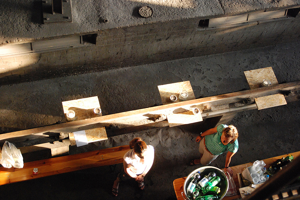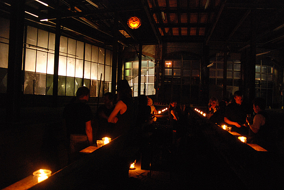 In der Eingangshalle erwartete den Besucher neben einem ersten Eindruck der Architektur und Informationen über den Ringlokschuppen die „Grubenbar“. Ein Ort der Begegnung und Erfrischung in einer der Wartungsgruben (entwickelt aus den vorgefundenen Gleiskonstruktionen), der die Gäste bis weit in die Nacht hinein die Halle aus Sicht der früheren Betriebsarbeiter und Handwerker erleben ließ. Diese Atmosphäre wurde durch von Soundkünstlern verfremdete Bahngeräusche und vor Ort erzeugte sanfte Bassklänge noch unterstrichen.