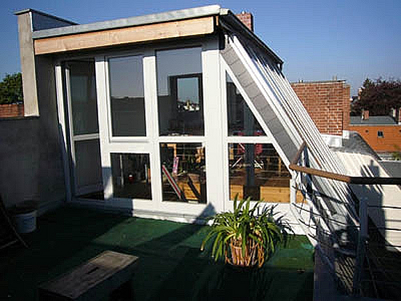 Raum: Der Dachgeschossausbau ist bereits eine Raumerfahrung für sich, die Räume sind unvergleichbar individuell. In diesem Fall wurde das Raumgefühl noch durch einen weiteren Aufbau verdoppelt. Neben den Dachterrassen entstand ein Wintergarten mit Blick über die Hauptstadt.