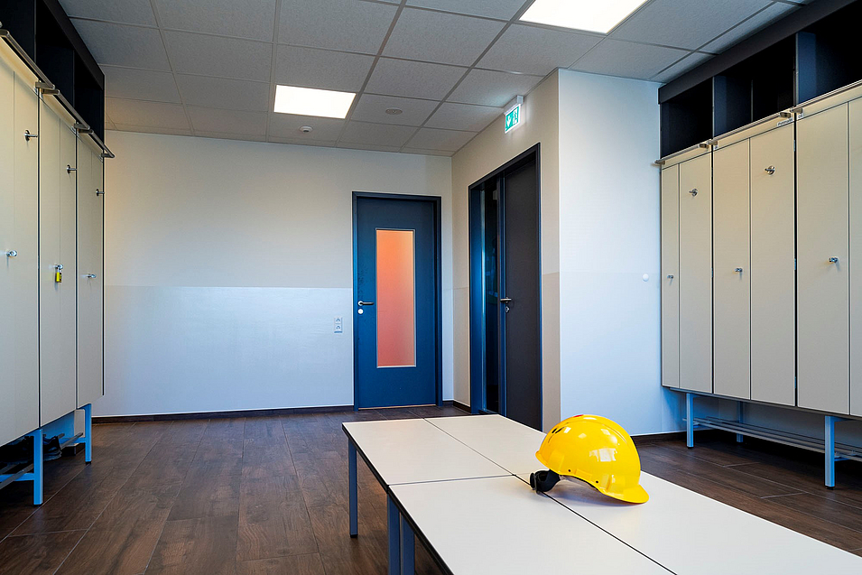 Die Energy from Waste GmbH plant, baut und betreibt seit rund 30 Jahren Abfallverwertungs- und -beseitigungsanlagen. Einer der 17 Standorte befindet sich in Hannover, wo im Verwaltungsgebäude die Sozial- und Sanitärbereiche mit einer Gesamtfläche von ca.155m² BGF modernisiert wurden. Die Bestandsräumlichkeiten im 3.OG waren räumlich kleinteilig und wurden bis auf die tragenden Stützen und Schächte vollständig entkernt. Der neue Umkleidebereich ist nun offener und großzügiger gestaltet, der Duschbereich wurde zentral und neu angeordnet. Zudem wurden die WC-Räume mit mehr natürlicher Belichtung ausgestattet. Der vorherige separate Flur ist nun Teil des Umkleidebereichs, wodurch der gesamte Bereich heller und weitläufiger wirkt. Im Zuge der Modernisierung wurden zudem sämtliche TGA-Leitungen neu verlegt und eine Fußbodenheizung installiert. Die Umkleidespinde mit Schwarz/Weiß-Einteilung werden über eine Lüftungsanlage in der abgehängten Decke versorgt. Das Farbkonzept, mit orangefarbenem Akzent, orientiert sich am Corporate Design der EEW.