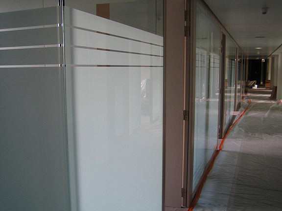 Material: Alle drei Gebäude wurden mit einem Design- und Farbkonzept ausgestattet. Die Teppichböden in Beige bis Braun. Die Farben der Möbel sind Grau, Dunkelrot und Crème. Die Materialien edel ausgesucht: Steinfußböden in dunkelgrauem Feinsteinzeug, lederbezogene Tresen, lackierte Glasflächen, abgehängte Akustikdecken, Beleuchtungskörper und –möbel von Philippe Starck u.v.m. Die Treppenhäuser wurden in dem vorhandenen klassizistischem Erscheinungsbild aufgefrischt.
