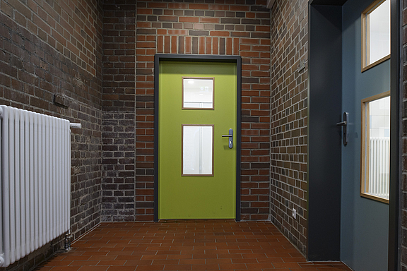 1.BA: Die vorhandenen Ausbauten wurden gesamt rückgebaut, schädliche oder defekte Materialien fachgerecht ausgebaut und entsorgt. Ausstattung, Grundrissaufteilung und Aspekte der Barrierefreiheit wurden dem heutigen Standard angepasst. Die neue Verteilung von Ver- und Entsorgungsleitungen bedurfte kleinerer Eingriffe (wie Kernbohrungen) in die vorhandenen Stahlsteindecken. Der Einbau von Abluftgeräten in die bereits vorhandenen Entlüftungsöffnungen im Mauerwerk hat das Erscheinungsbild der Fassade nicht verändert.
