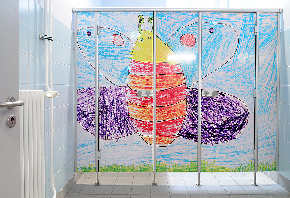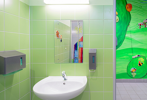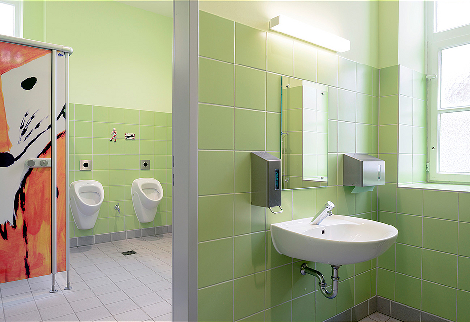 Maßnahmen: Aus Budgetgründen betraf die Maßnahme nur die Sanitäranlagen vom 1. bis 3. OG auf der Südseite des Schulgebäudes.