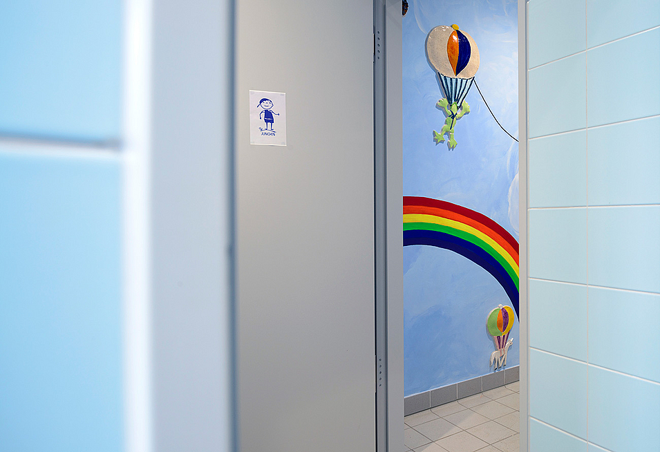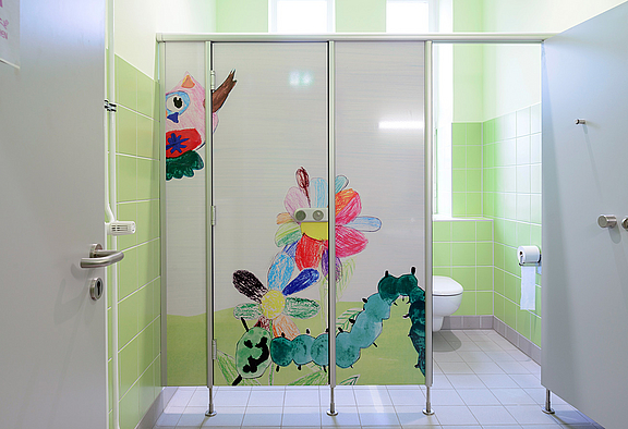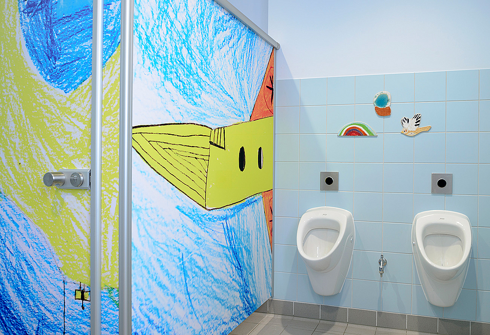Ist-Zustand: Das Schulgebäude besteht aus einem ca. 100m langen, viergeschossigen Riegel an dessen Enden sich die WC- Anlagen für Mädchen auf der Nordseite und für Jungen auf der Südseite befanden. Um die langen Wege von fast 100m zwischen den Sanitärkernen aufzulösen, wurden die Grundrisse gemäß aktuellen Vorschriften (VDI 6000.6) und unter Berücksichtigung der Barrierefreiheit neu gegliedert. Außerdem befanden sich die Sanitäranlagen, Südseite im 1. bis 3. OG, technisch und hygienisch in einem stark sanierungsbedürftigen Zustand.