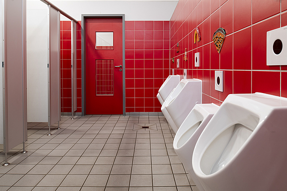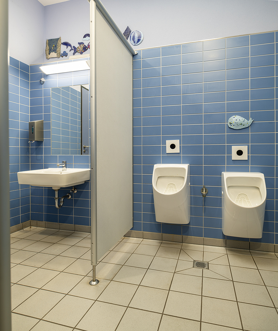 1.) Farbbereich ROT - Pausenhalle WC Jungen EG: Die Anzahl der Waschbecken und Urinale wurde reduziert, ansonsten handelt es sich um eine 1:1-Modernisierung.
