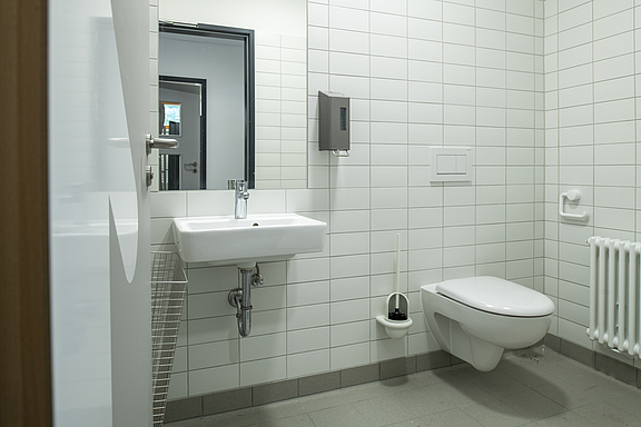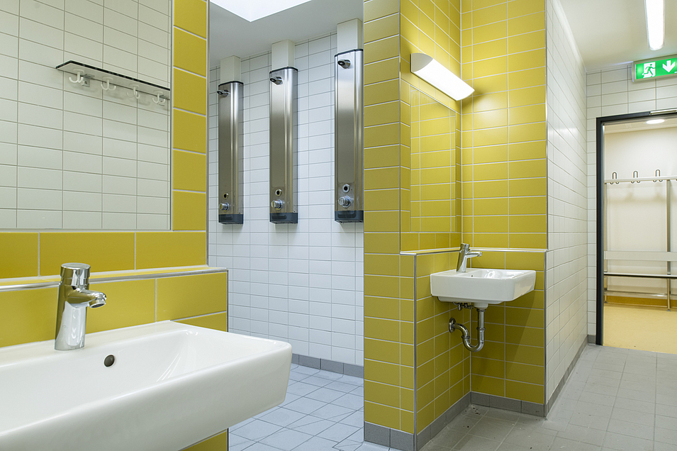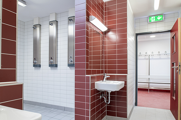 Da es insgesamt acht definierte WC-Anlagen Bereiche im Schulgebäude und der Sporthalle gab, mussten die Maßnahmen in erst zwei, später drei Bauabschnitte aufgeteilt werden. Die WC-Bereiche wurden ursprünglich flächenmäßig sehr knapp bemessen und geplant. Im Zuge der Modernisierung schafften wir großzügigere Sanitärbereiche und reduzierten gemäß Umrechnungsschlüssel überschüssige WCs, Urinale und Duschen. Im Verlauf der Bauarbeiten und Maßnahmen im Bereich der Sporthalle wurden bauliche Mängel in den Umkleideflächen und Sanitärbereichen festgestellt, so dass schließlich der gesamte Umkleide-, Sanitär- und Geräteraumbereich inklusive Serviceräume entkernt und modernisiert wurde.