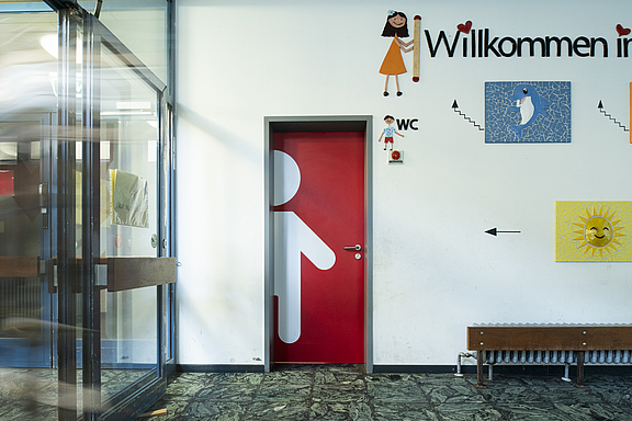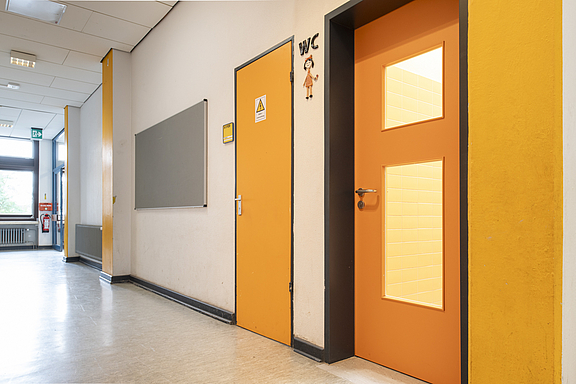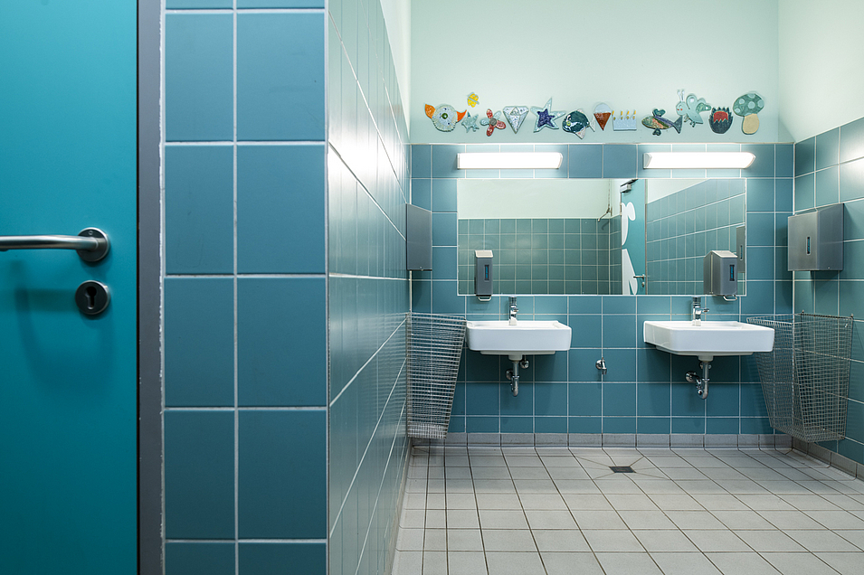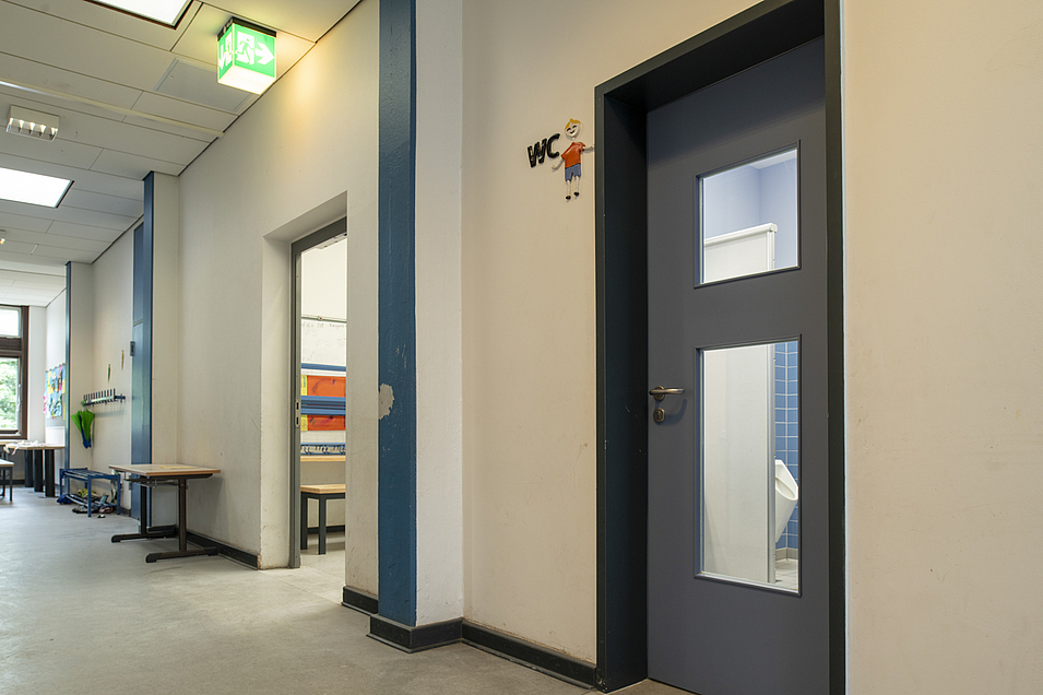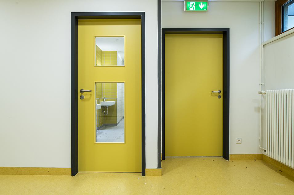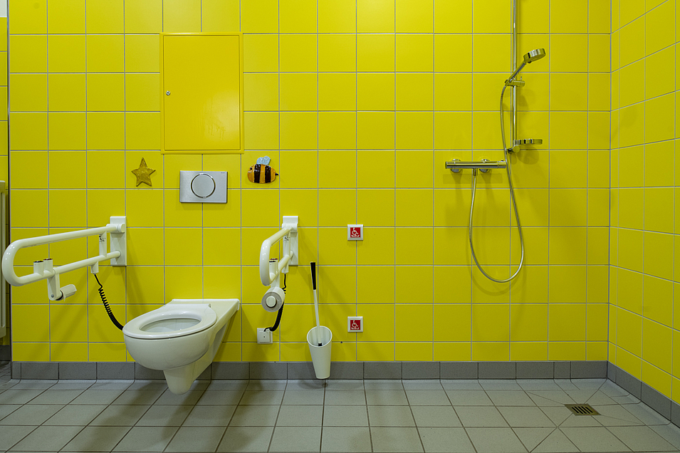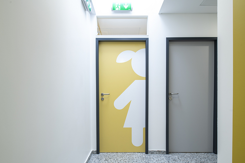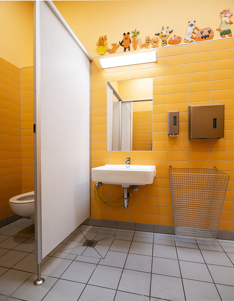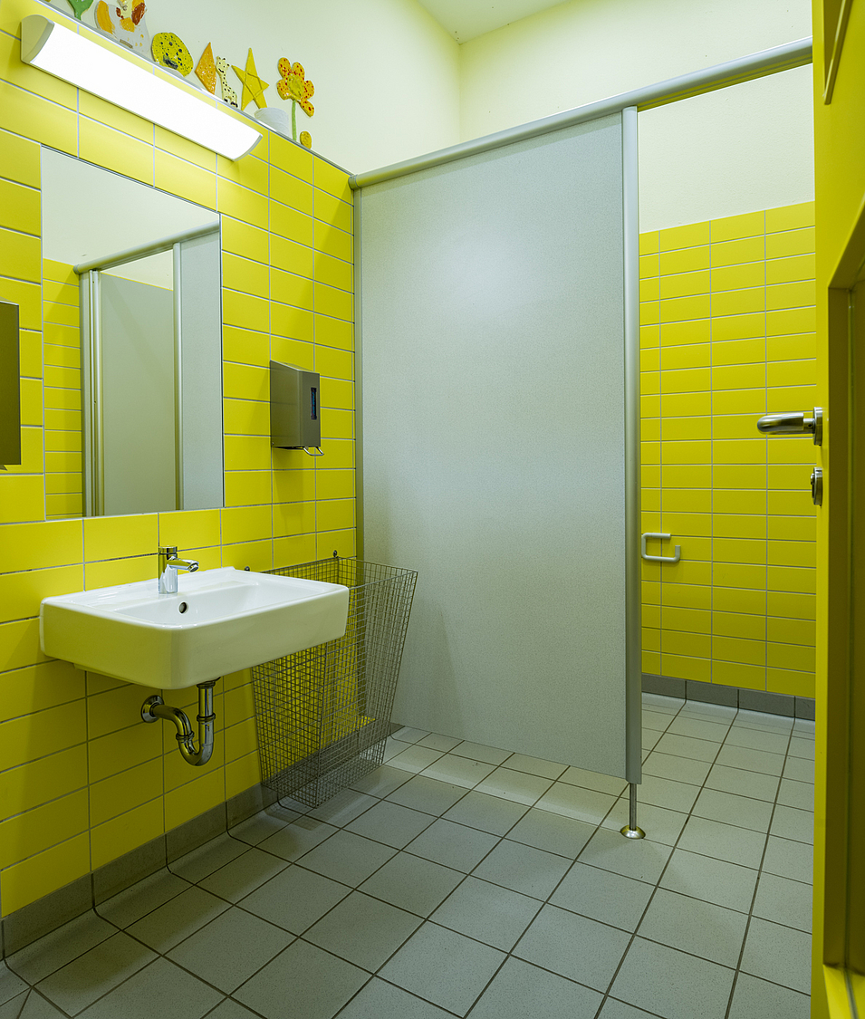 3.) Farbbereich GELB - WCs Jungen/Mädchen/Pflegeraum EG: Im Pflegeraum fand eine 1:1 Modernisierung statt. In den Jungen- und Mädchen-WCs wurde die Anzahl der Sanitärobjekte jeweils um eine Toilette reduziert, sodass ausreichend große Bewegungsflächen und Kabinentiefen erreicht wurden. Zusätzlich wurden die Zugangstüren vergrößert.