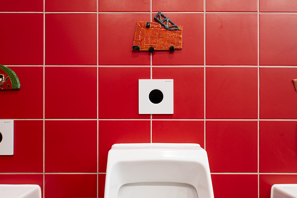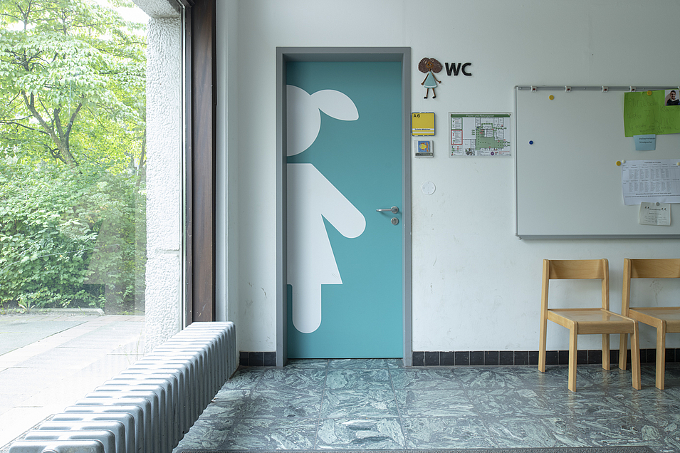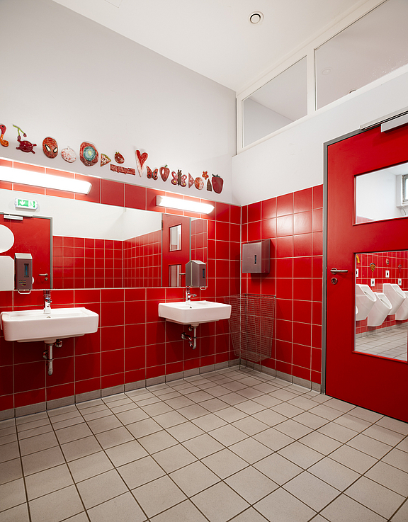 Alle WC-Bereiche im Schulgebäude und der anliegenden Sporthalle mit Umkleidebereich befanden sich noch im Originalzustand. Die geplanten Maßnahmen und das Gestaltungskonzept wurden mit der Schulleitung abgestimmt. Es war ein schulinternes Farbkonzept gewünscht, welches gleichzeitig als Orientierungssystem für die verschiedenen Gebäudebereiche bzw. Schulstufen dient. Außerdem sollten auch hier, im Zusammenhang mit der Modernisierung, die Sanitäranlagen im Rahmen eines neuen Keramico-Kunstprojektes mit Hilfe der Schüler und Schülerinnen individuell gestaltet werden.
