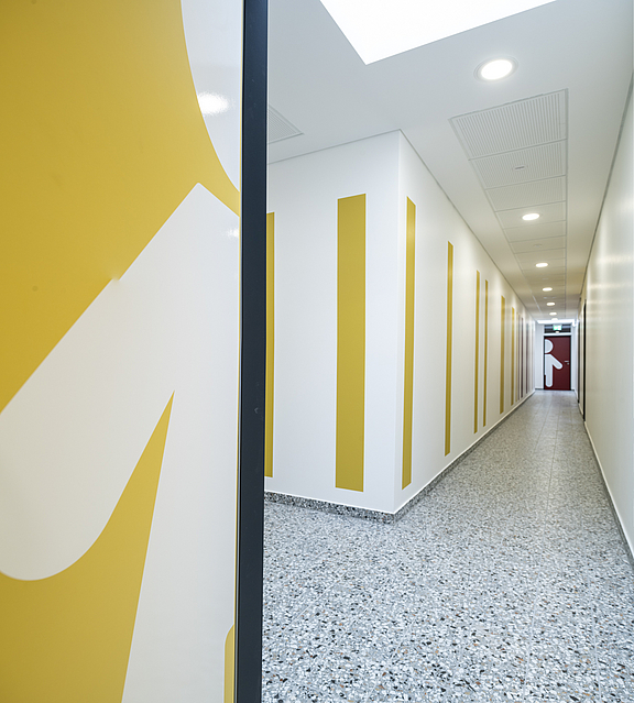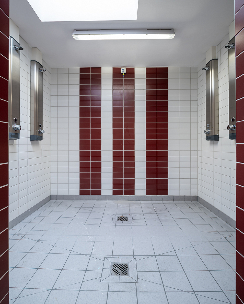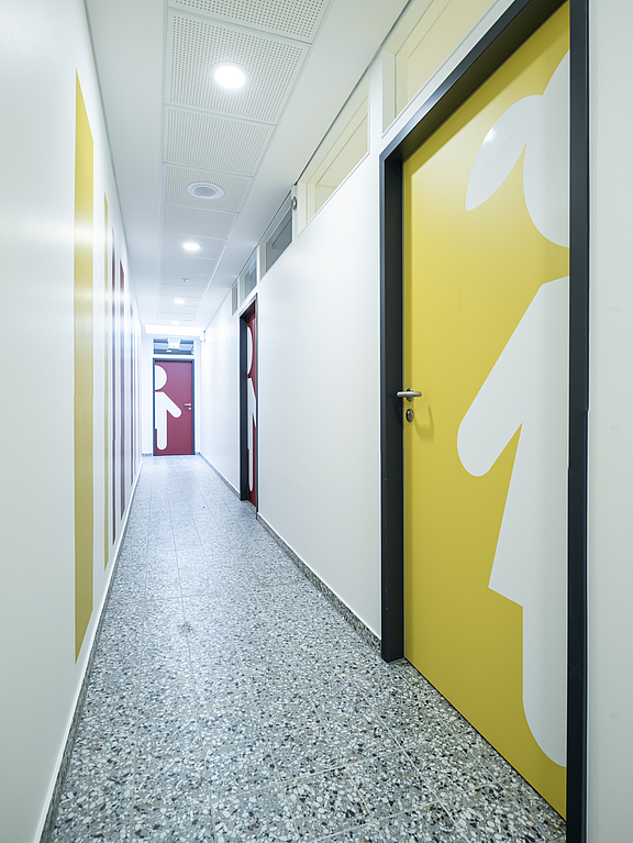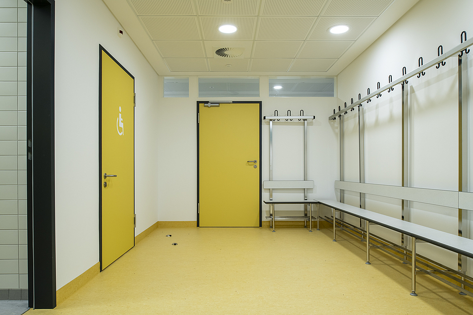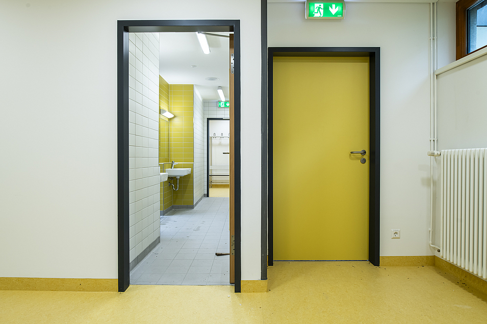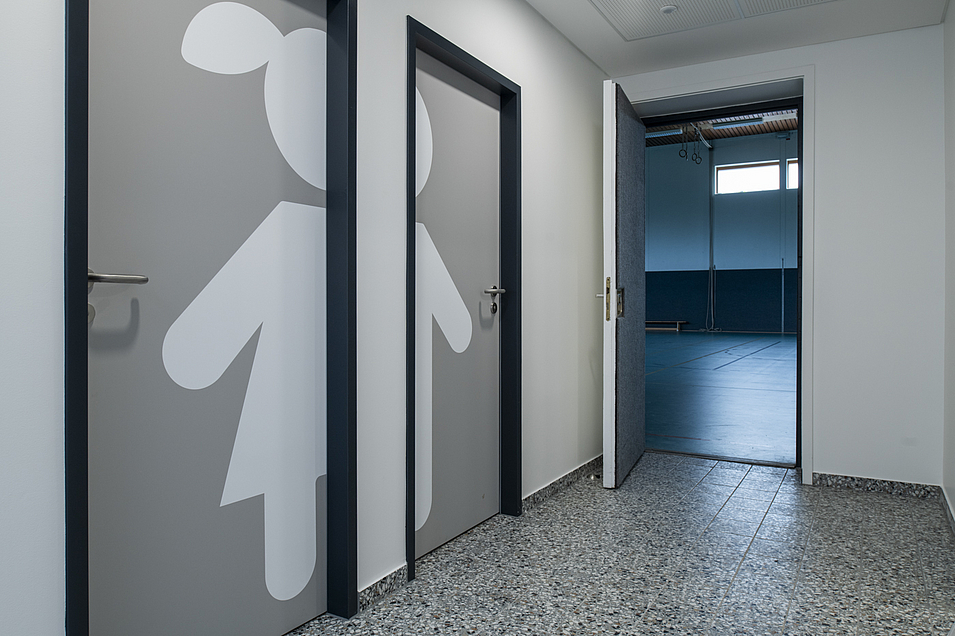 6. & 7 & 8.) Sporthalle: - Farbbereich DUNKELROT - Jungen/Sanitär/Umkleiden/sechs Duschen und - Farbbereich SENFGELB - Mädchen/Sanitär/sechs Duschen und Farbbereich GRAU - Besucher-/Personal Einzel WCs sowie Regieräume, Geräteräume und Flure. Die Einzelduschen wurden zurückgebaut. In beiden Umkleidebereichen sind jeweils ein Standard- und ein barrierefreies WC entstanden.