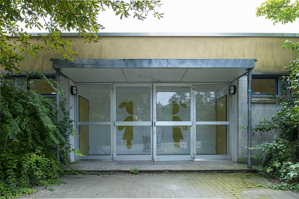 Umkleidebereich der Sporthalle: Mit den Abbruchmaßnahmen zeigte sich schnell, dass die Innenausbau-Strukturen der WC-Anlagen in den Trennwänden der Holzständer-Werkskonstruktion durch ehemalige Wasserschäden in Mitleidenschaft gezogen waren und somit eine Kernsanierung aller Flächen notwendig wurde. Schadstoffhaltige Materialien wurden fachgerecht ausgebaut und entsorgt. Die Fassadenaußenwände und der Deckenbereich (Flachdach) wurden von innen energetisch ertüchtigt. Die TGA-Installationen und die Brandschutzanforderungen wurden nach aktuellen Standards modernisiert. Ausstattung, Grundrissaufteilung und Aspekte der Barrierefreiheit wurden den heutigen Erfordernissen innerhalb der Grenzen der Bestandsflächen angepasst.