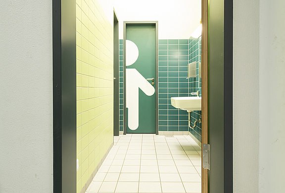 2.) Farbbereich TÜRKIS - Pausenhalle WC Mädchen EG: Die Anzahl der Waschbecken und Toiletten wurden reduziert, wodurch größere Kabinentiefen sowie ein breiterer Gang zwischen den Kabinen entstand.