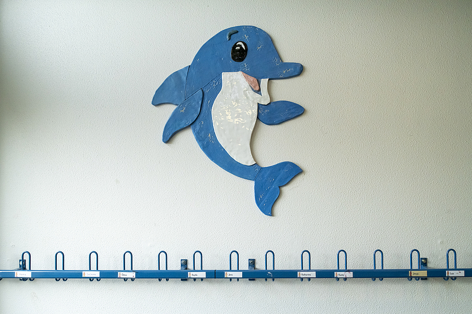4.) Farbbereich BLAU und ORANGE - WCs Jungen/Mädchen/Elektro OG: In den WC-Bereichen blieb die Anzahl der Sanitärobjekte gleich, eine Neuordnung war allerdings notwendig, um eine ausreichende Kabinentiefe und Bewegungsfläche zu schaffen. Dafür wurde die mittlere Trennwand neu angeordnet. Der Putzmittelraum wurde vom Lager zum reinen Elektrounterverteilungsraum umgenutzt.
