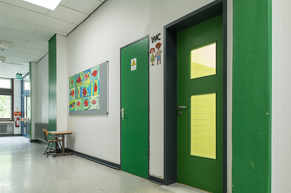 5.) Farbbereich GRÜN - WCs Jungen/Mädchen/Elektro/PuMi OG: Hier sind auch neue Mädchen- und Jungen-WCs entstanden, um im Obergeschoss kürzere Laufwege zu erreichen. Der Putzmittelraum wurde vom Lager zum reinen Elektrounterverteilungsraum umgenutzt. Durch die Zusammenlegung des Hauptzugangs Mädchen-/Jungen-WC entstand ein neuer größerer Putzmittelraum.