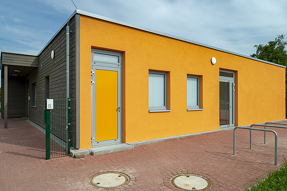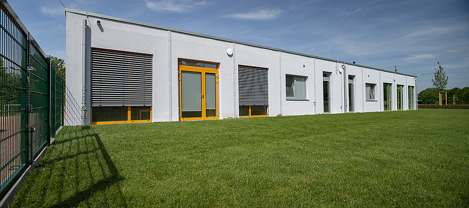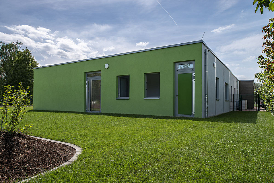 Aufgrund der großen Nachfrage nach Betreuungsplätzen im Gemeindebereich der Stadt Seelze kam mit der Vorgabe einer möglichst kurzen Realisierungszeit für den Neubau einer Zwei-Gruppen Kita nur eine vorgefertigte Modulbauweise in Betracht. Das mit einem Flachdach versehene Gebäude ist eingeschossig und barrierefrei zugängig. Die lineare Anordnung der 2 x 10 Module im ökologischen Holzrahmenbau ergibt einen mittig liegenden, lang gestreckten Erschließungsflur und gleichzeitige Spielzone.