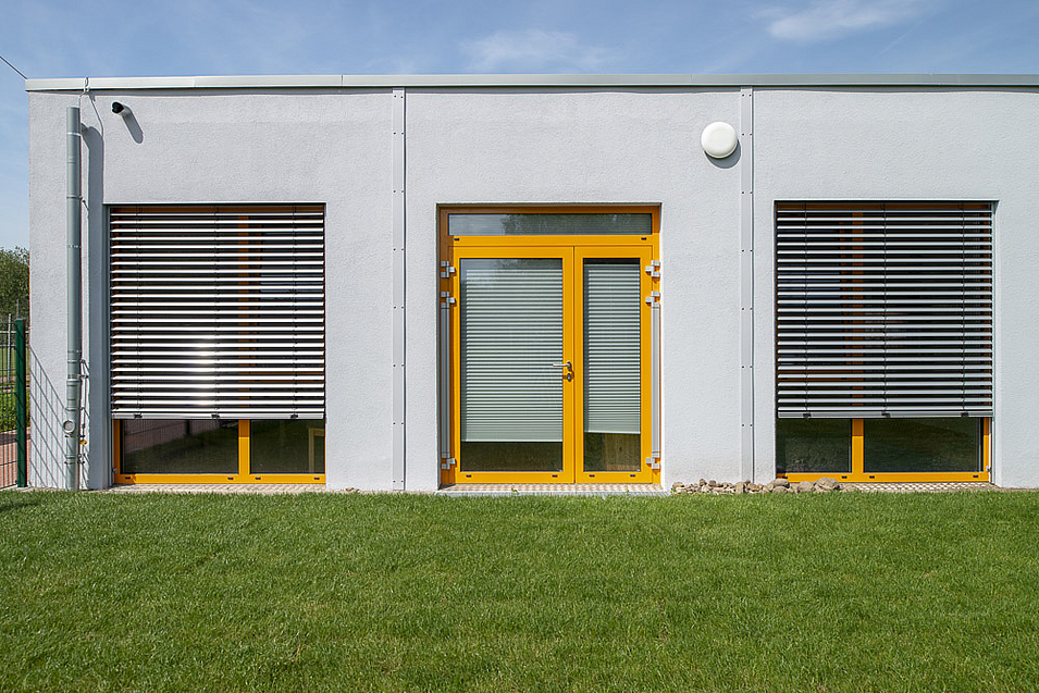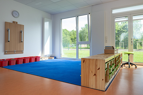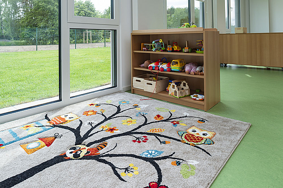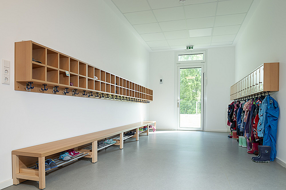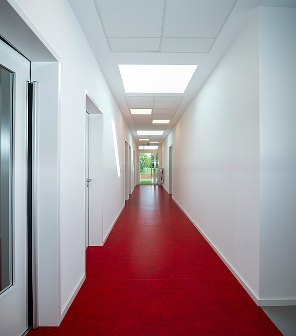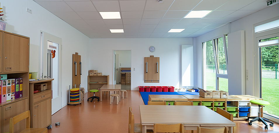 Von dieser mittigen Achse gehen nach Süden die beiden gleich großen Gruppenräume, beigefügten Kinder-Sanitärräume und Garderoben ab. Auf der Nordseite befinden sich Haupteingang, Büro- und Personalräume, haustechnische und hauswirtschaftliche Versorgung sowie die Kinderruheräume. Ein einfaches Farbkonzept im Bodenbereich sowie bei den Fensterflächen und deren zugeordneten Fassadenflächen gliedern die definierten Nutzungsbereiche.