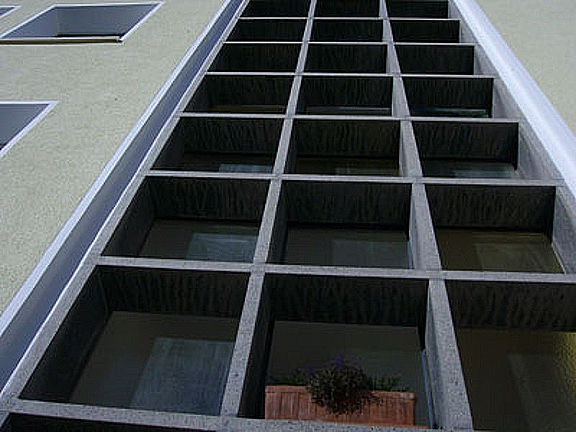 Materialien: Die vorgefundene Konstruktion und die Materialien der 50er Jahre sind zwar überwiegend unbedenklich, weisen aber in Bezug auf Wärmedämmung, Speicherfähigkeit und das entsprechende Raumklima einige gravierende Mängel auf. Hinzu kamen bereits des öfteren aufgetretene Feuchtigkeitsschäden und Schimmelbildung in den Räumen. Die Fassaden wiesen bereits einige Konstruktions- und Feuchteschäden auf. Für die Wärmedämmung wurde als Kompromiss zwischen Kosten und Ökologie Steinwolle auf die Fassaden montiert und verputzt, teilweise wurde mit Innendämmung gearbeitet. Auf dem Flachdach wurden hochdämmende PIR–Dämmplatten, sowie eine sehr hochwertige Kunststoffbahn eingesetzt. Durch den etwas heller gewählten Putz und die weißen Fensterlaibungen macht das Gebäude einen sehr freundlichen Eindruck und erfreut sich großer Beliebtheit, es genießt sein neues Ansehen!