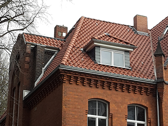 Das Dach des Ziegelbaus zeigte starke Wasserschäden im Bereich der Dachflächen und der Gauben. Außerdem fanden sich zerstörte Dachziegel und eine ungenügende Dachflächendämmung. Um das Dach auch energetisch zu modernisieren, wurde die Ausführung eines neuen Dachaufbaus konzipiert.