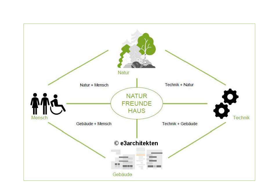 Der Idee des klimaresilienten Bauens am konkreten Beispiel des Naturfreundehauses Hannover liegt das Verständnis zugrunde, dass alles mit allem zusammenhängt – in diesem Fall fokussiert sich das Beziehungsgeflecht von Mensch und Natur über Gebäude und deren Haustechnik. Ausgehend von der Bestandsanalyse, dem Aufzeigen der Mängel in Bezug auf eine geplante Gebäudeoptimierung, einer Verbesserung von Gelände- bzw. Naturgegebenheiten sowie dem Ausschöpfen von Potenzialen in der Bestandssituation sehen wir die Möglichkeit, die vier Aspekte Gebäude / Natur / Mensch / Technik in ihren Zusammenhängen und Abhängigkeiten gemeinsam zu bearbeiten, zu verbessern und erlebbar zu machen – der Name ist Programm.