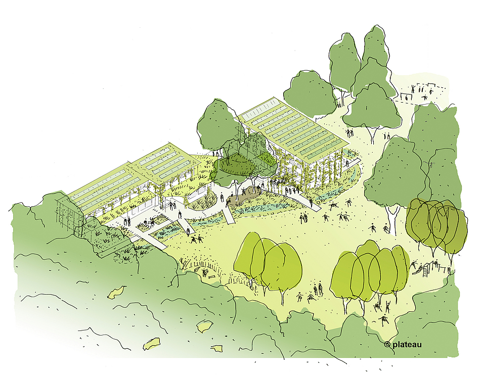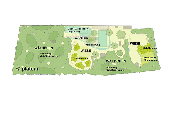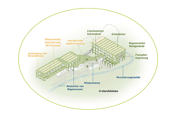 Parallel wurde erkannt, dass insbesondere in einem naturnah gelegenen Gebäude mit Anspruch auf positives Umwelterleben der Nutzer*innen die Chance zum Aufzeigen von Lösungen für Umweltprobleme gegeben sein kann. Das bestehende Gelände stellt einen Natur-Experimentierraum dar – in der Spannbreite von Flächen ohne menschliches Eingreifen bis hin zur Nutzungsgestaltung.