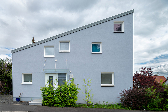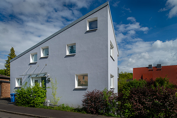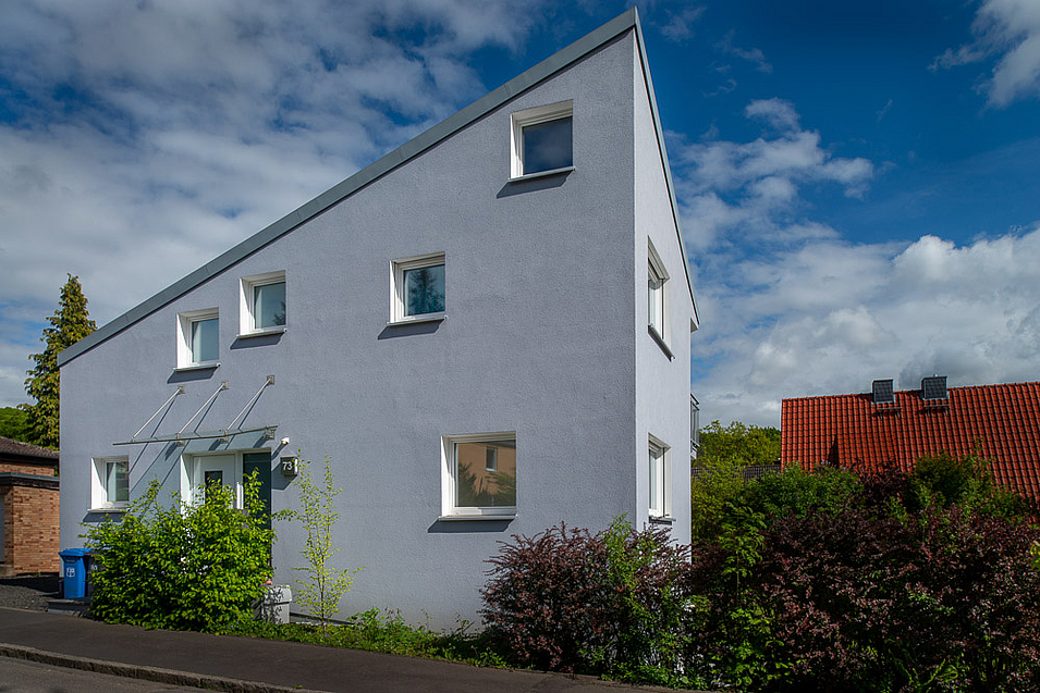 Auf dem ehemals mit einem Bungalow aus den 70er Jahren bebauten Hanggrundstück sollte ein Passivhaus erstellt werden. Der Altbau wurde bis auf einen Restkeller abgerissen, das neue Gebäude geschickt so im Hang positioniert, dass optimale Bedingungen für eine moderne Solararchitektur geschaffen werden konnten. Es entstanden eine geräumige Wohnung über zwei Etagen und eine kleine Einliegerwohnung im Untergeschoss. Im Gebrauch steht hier nun ein Plusenergiehaus!