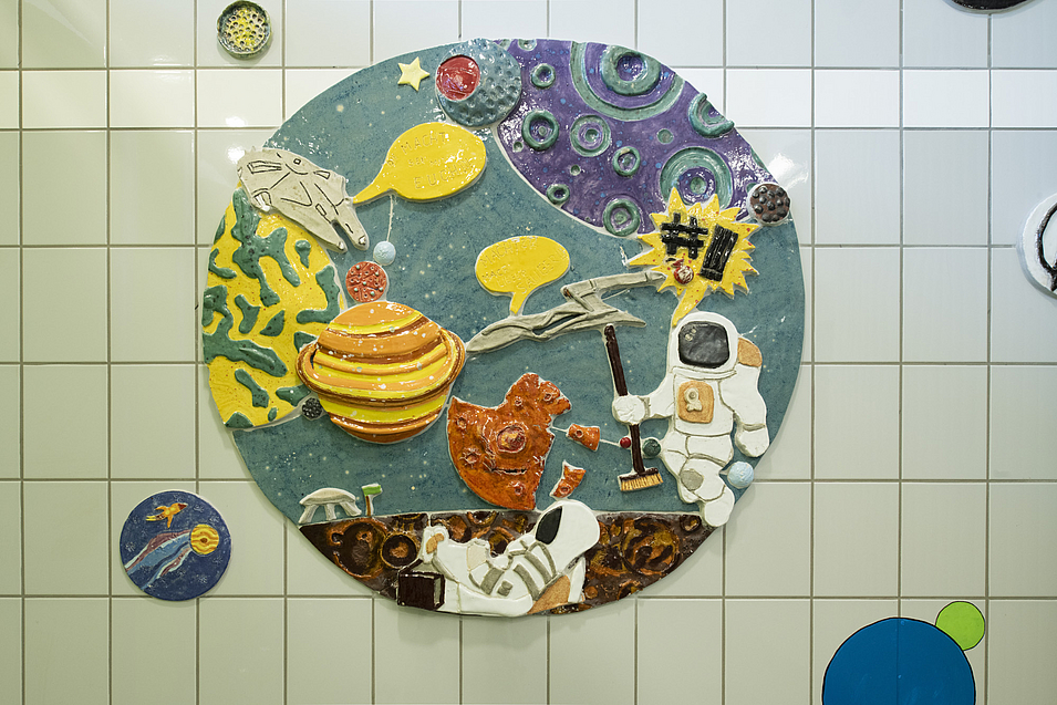 Ursprünglich sollte auch in diesen Räumen nur minimalinvasiv modernisiert werden, doch bei Ausbau der Sanitärobjekte zeigten sich durchgehende Korrosionsschäden in der Installationsebene. Es wurde bis auf Rohbauoberflächen entkernt, die Außenwand nach Möglichkeiten von innen energetisch verbessert und dann unter Berücksichtigung der vorhandenen Fliesenoberflächen mit den Wandkeramiken alles wieder neu gemäß Planung aufgebaut. Nach Ende der Modernisierung wurde hier das vorhandene Keramico-Schulprojekt in Zusammenarbeit mit den Künstlern Burhan Uzunyayla und Yasemin Yilmaz und den Schülern und Schülerinnen der RS wieder vervollständigt.