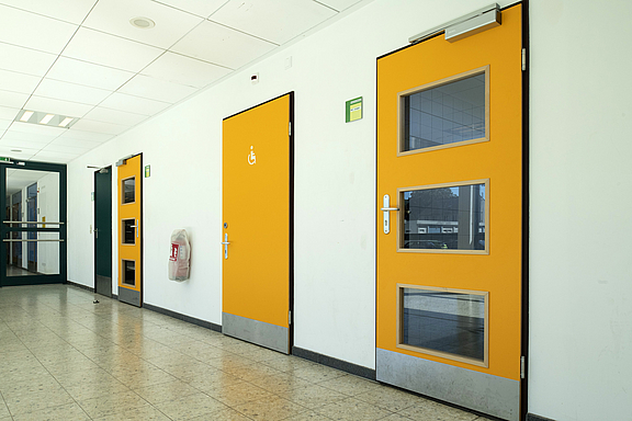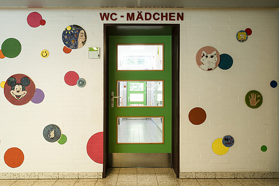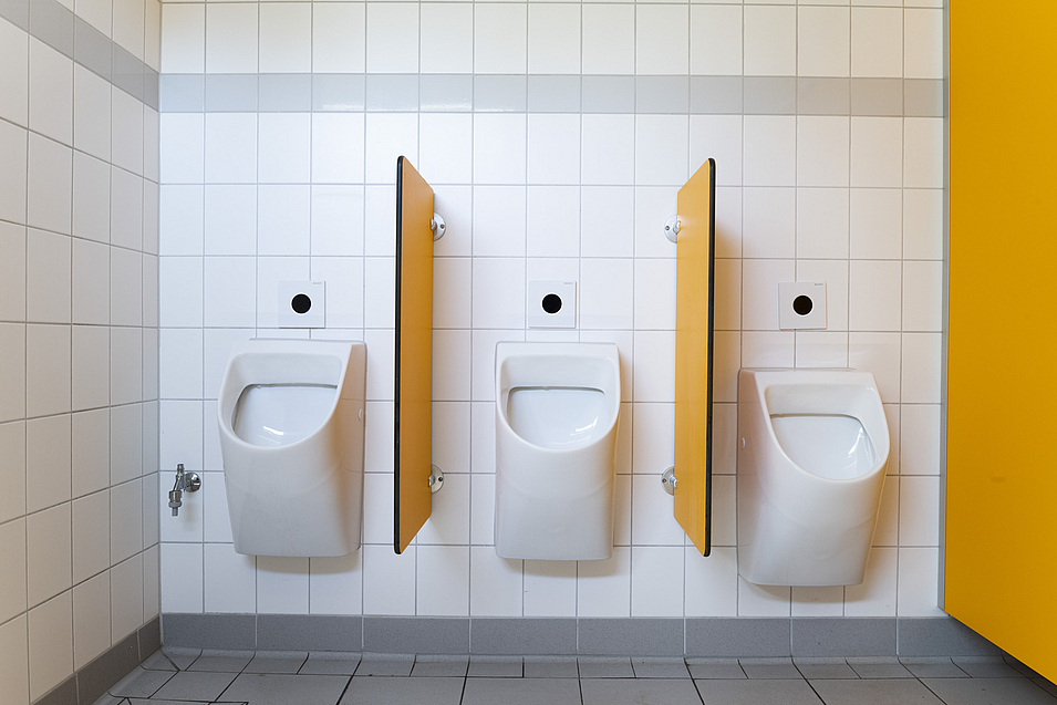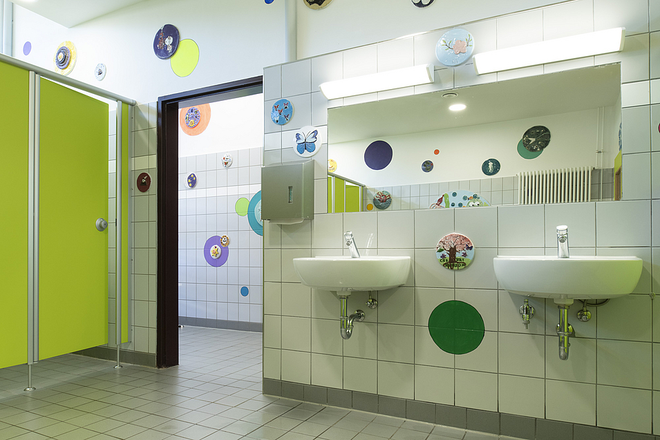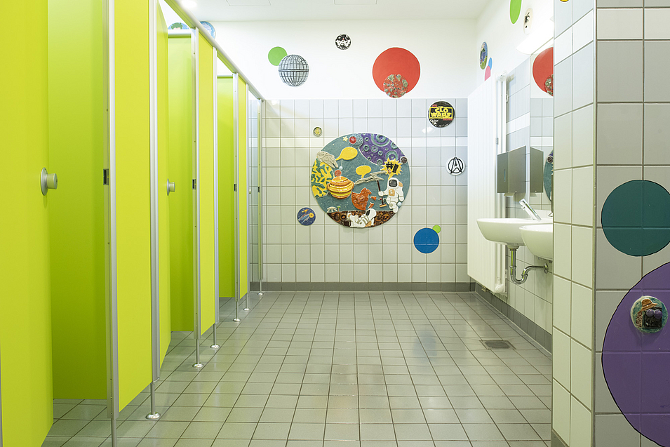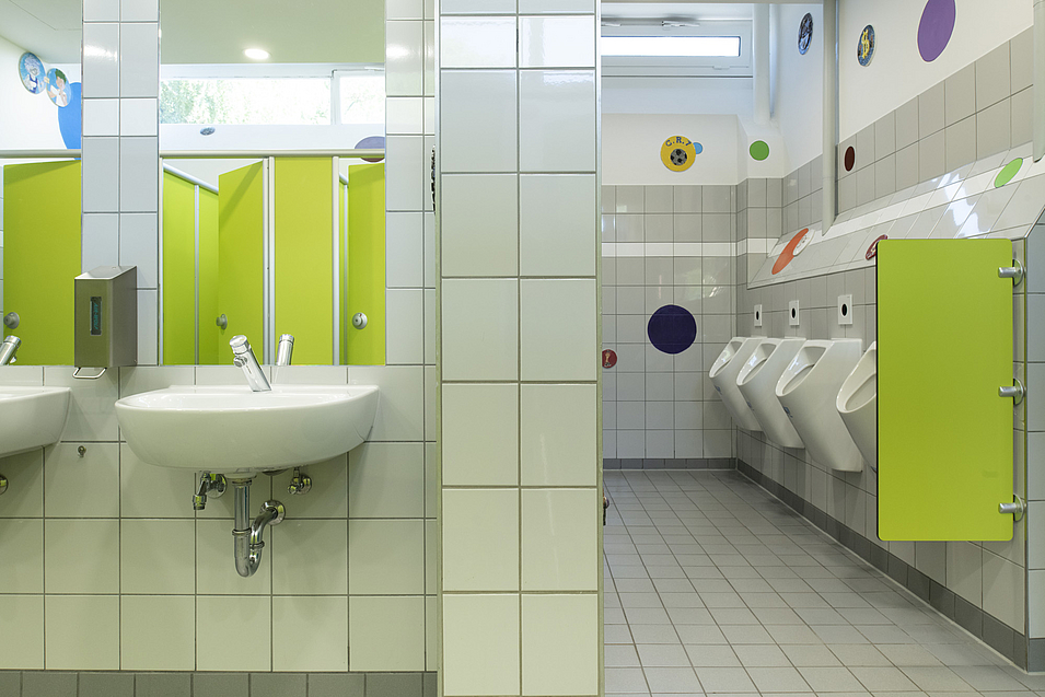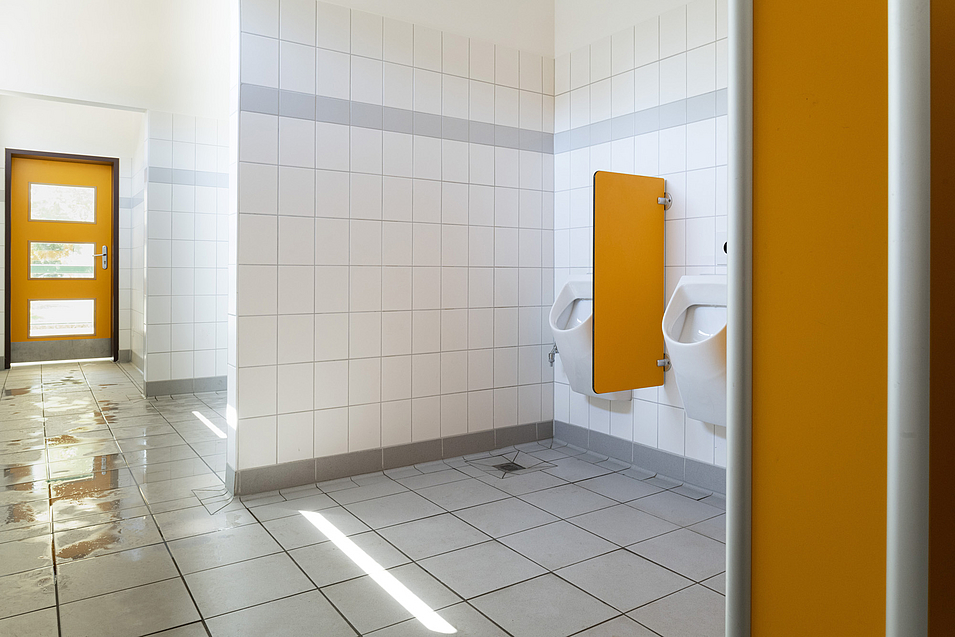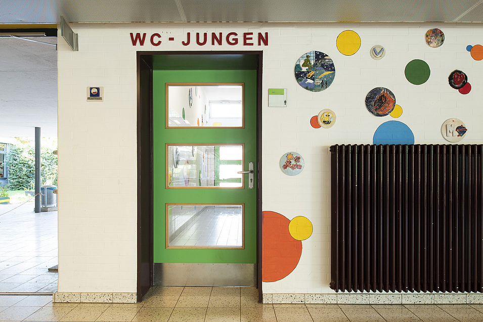 Im Jungen-WC sind nun, anstatt der Trockenurinale, Spülungsurinale in Nutzung und die Waschbecken wurden neu angeordnet. Die Anzahl der Urinale wurde um eines reduziert, um die Bewegungsflächen zu vergrößern. Ähnlich wurde im WC-Raum der Mädchen die Innenaufteilung optimiert. Der dort innenliegende nur provisorische Putzmittelraum wurde durch eigene Trockenbauwände zu einem vollständig abgetrennten Raum. Das bereits vorhandene, von der Pausenhalle erreichbare, barrierefreie WC erhielt eine neue Tür, die gem. der Richtlinien nach außen aufgeht. Die Wand zwischen Jungen-WC und barrierefreiem WC wurde raumhoch geschlossen. In allen WC-Bereichen wurde eine abgehängte Decke für TGA-Installationen (Lüftungsanlage auf dem Dach und Heizung/Elektro/Wasser) neu eingebaut.