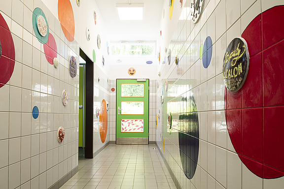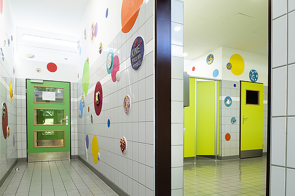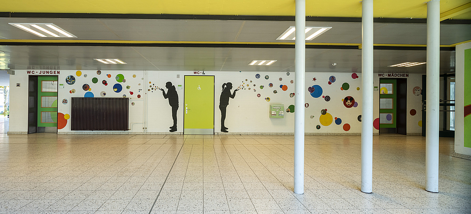 Pausenhalle: Die Wandflächen blieben aufgrund eines Kunstprojektes weitestgehend in ihrem aktuellen Zustand erhalten. Im Mädchen- und Jungen-WC wurden sämtliche Edelstahlobjekte (Waschbecken, Toiletten, Spiegel) durch Toilettenkeramik ersetzt.