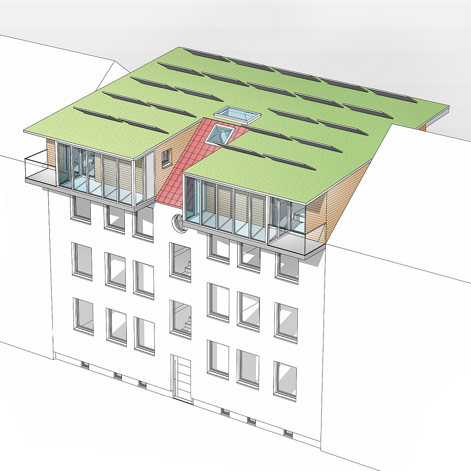 - Ausbau und Optimierung der Grundrisse der Dachgeschosse mit Balkonfenstern bzw. zusätzlichen Gauben,