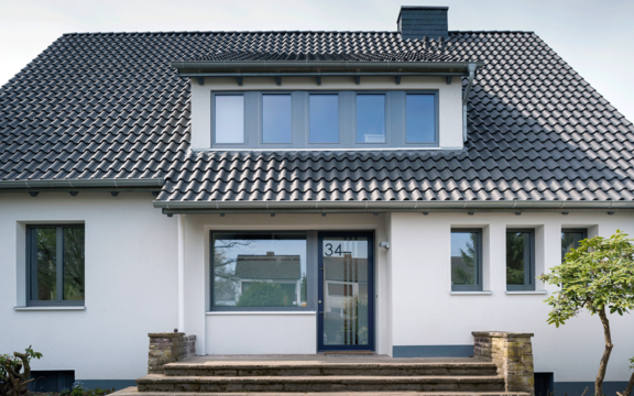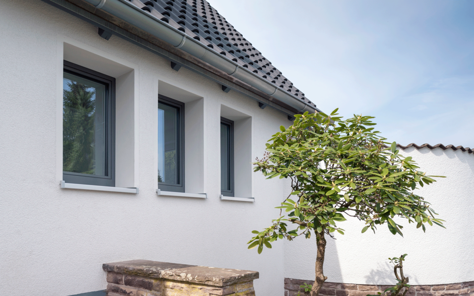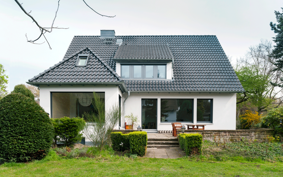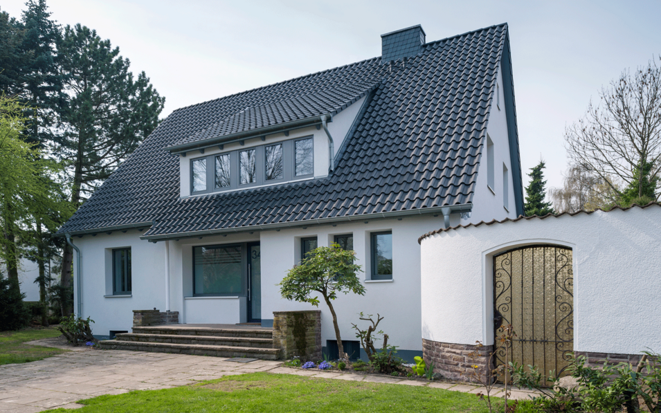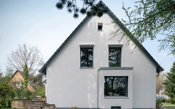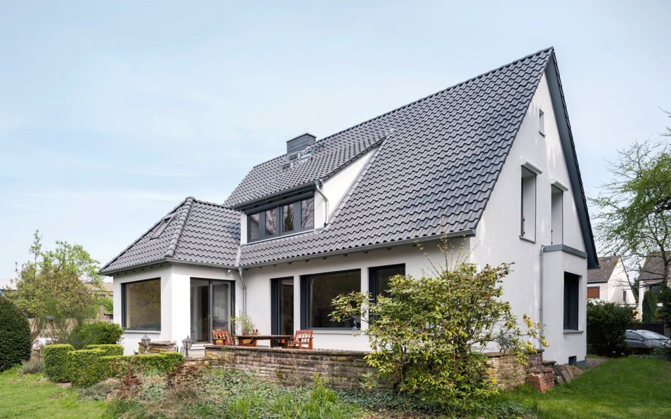 Umbau einer kleinen, aber vornehmen Vorstadtvilla der 60er Jahre: Fokus neben der Energieeinsparung lag auf dem Erhalt nur behutsam veränderter Proportionen und Anschlussdetails. Das mediterran anmutende Flair des Wechselspiels von Putzfassaden und Natursteinmauern wurde dabei noch betont. Die dezente Farbabstimmung konnte im sorgfältig erstellten Farbkonzept und mit ausgewählten Materialien mit sichtbarem Erfolg realisiert werden: Tonziegel und Holz-Alu-Fenster in ausgewählten Anthrazittönen wirken zeitlos und passen sich der Patina vorhandener Steinplatten an. Die Baukosten konnten trotz des erheblichen Aufwands niedrig gehalten werden.