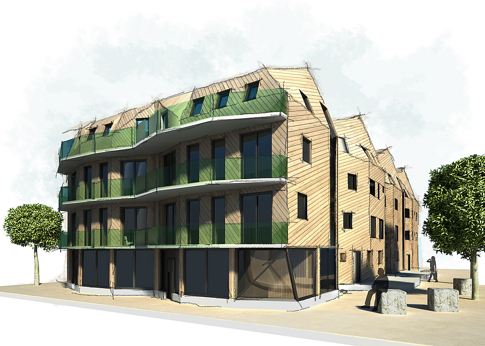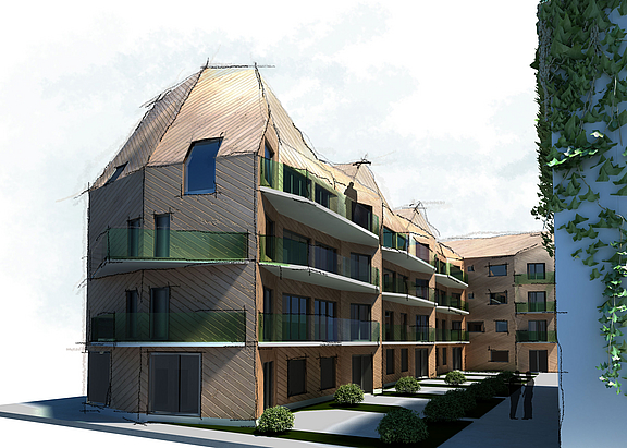 In der Gebäudesprache lehnt sich das monolithisch wirkende Gebäude im Dach an die vorhandenen Mansardendächer der Umgebung an. In der Ost- und Westansicht jedoch dreht es sich eindeutig in großzügige Sheddächer. Vier schräg gestellte Pultdächer unterstreichen die Unterteilung des Gebäudes in die geplanten Wohnmodule und runden die Stadtlandschaft zu einer Bergsilhouette ab.