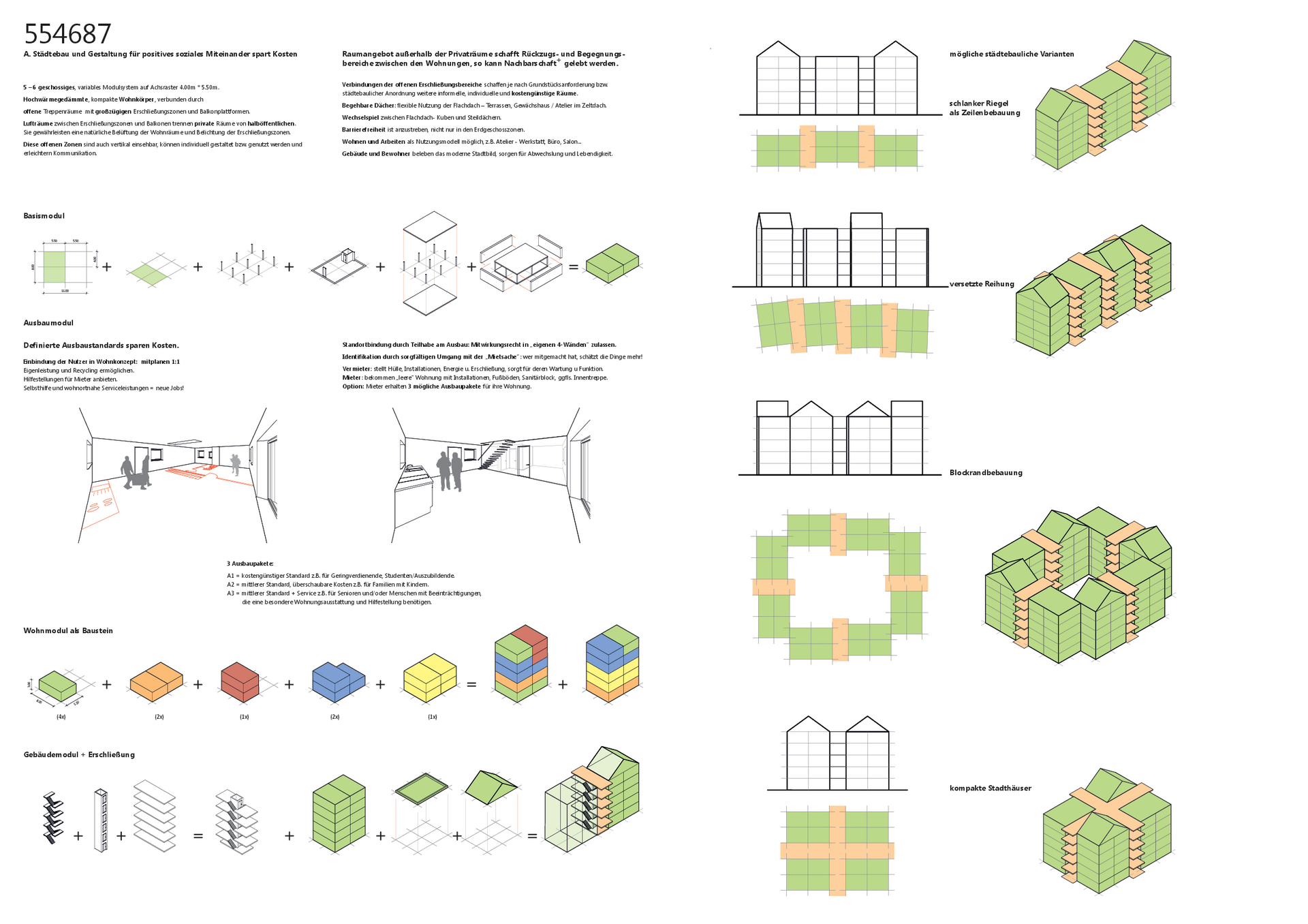 Die Wohnmodule mit den dazwischengeschobenen oder eingeschobenen Erschließungsebenen lassen eine Vielfalt an Anordnungsmöglichkeiten zu. Unabhängig von der Himmelsrichtung, der Grundstücksgröße oder -form kann die Ausformulierung der Wohnungen im beschriebenen Volumen entwickelt werden, z. B. kompakt in einer rechteckigen Anordnung, in einer offenen Reihung in einer Rundung oder als schlanker Riegel, auch kombinierbar als Hofanordnung.